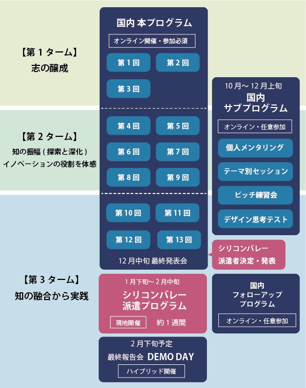 始動 Next Innovatorは、受講生全員が参加する「国内プログラム」と、選抜された20名のみが参加できる「シリコンバレープログラム」で構成されていされています。